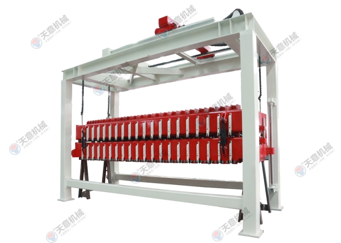 脫模后的坯體連同側(cè)板一起放置在切割小車上,切割小車由減速電機(jī)驅(qū)動行走,通過縱向切割機(jī)完成縱向切割,切割小車?yán)^續(xù)行走至橫向 切割機(jī)中間位置停止后,由小車置換裝置將側(cè)板連同坯體抬起,切割小車退回翻轉(zhuǎn)行車底下進(jìn)行下一次承載脫模后的坯體,另外一部切割小車 進(jìn)入置換裝置底下后, 置換裝置將側(cè)板連同坯體放置該切割小車上后,橫向切割動作后啟動進(jìn)行橫向切割動作,切割完成后,切割小車再行走至確地行車底下,再由 翻轉(zhuǎn)去底行車將坯體去底(連側(cè)板)吊至蒸養(yǎng)小車上,切割小車范圍原始位置進(jìn)行下一個切割循環(huán)。