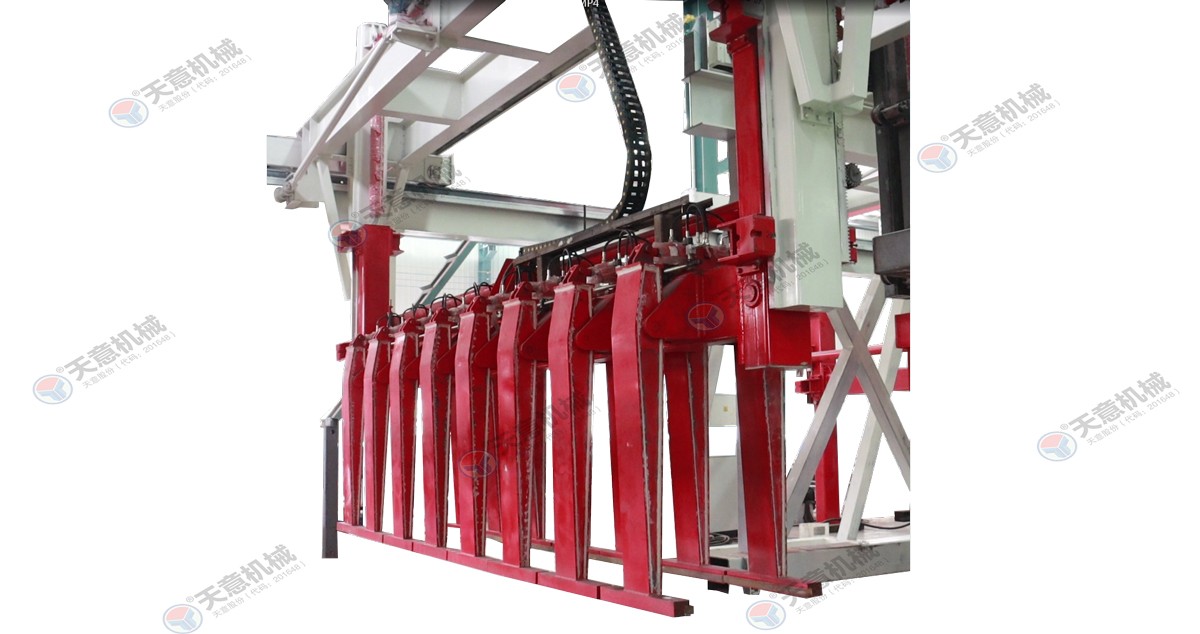 成品分垛吊機:將蒸養(yǎng)車上的一模坯體吊運至掰板輸送機上,然后將空側(cè)板吊運至蒸養(yǎng)車上;切割工段空翻脫模機將??蚍D(zhuǎn)90°,放在切割小車支座上進行脫模,脫模后的??蚺c清理后的側(cè)模板進行合模,合膜后的空模框被吊...