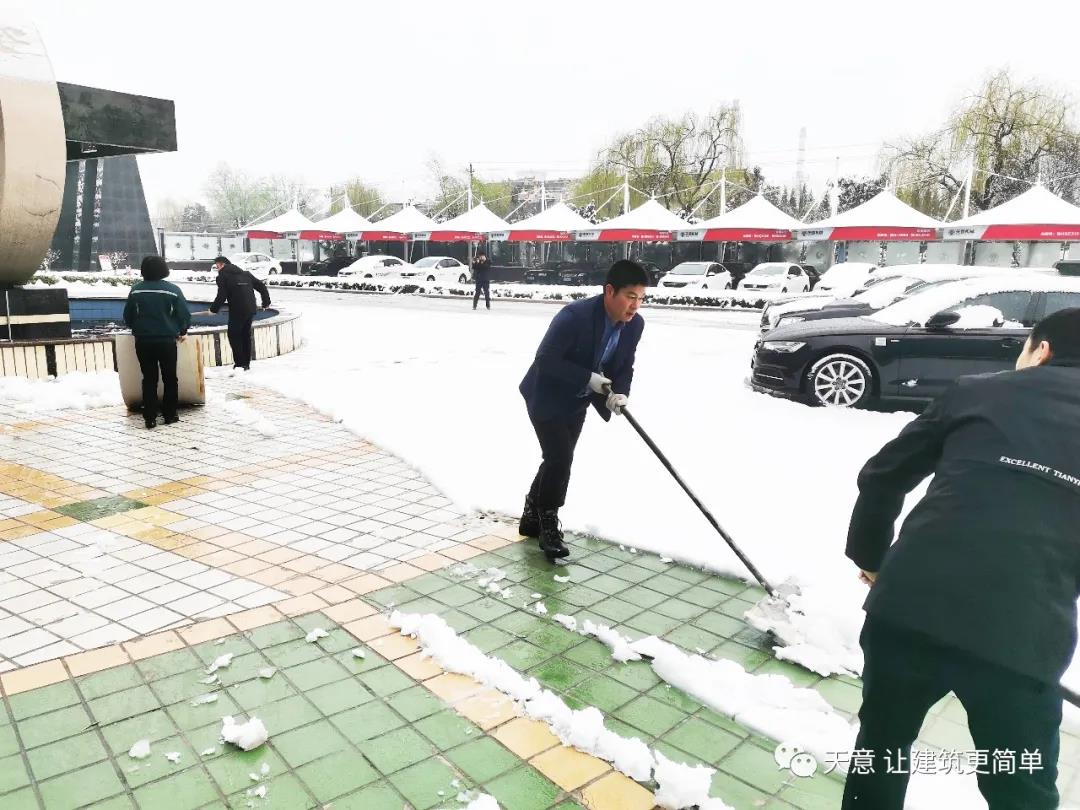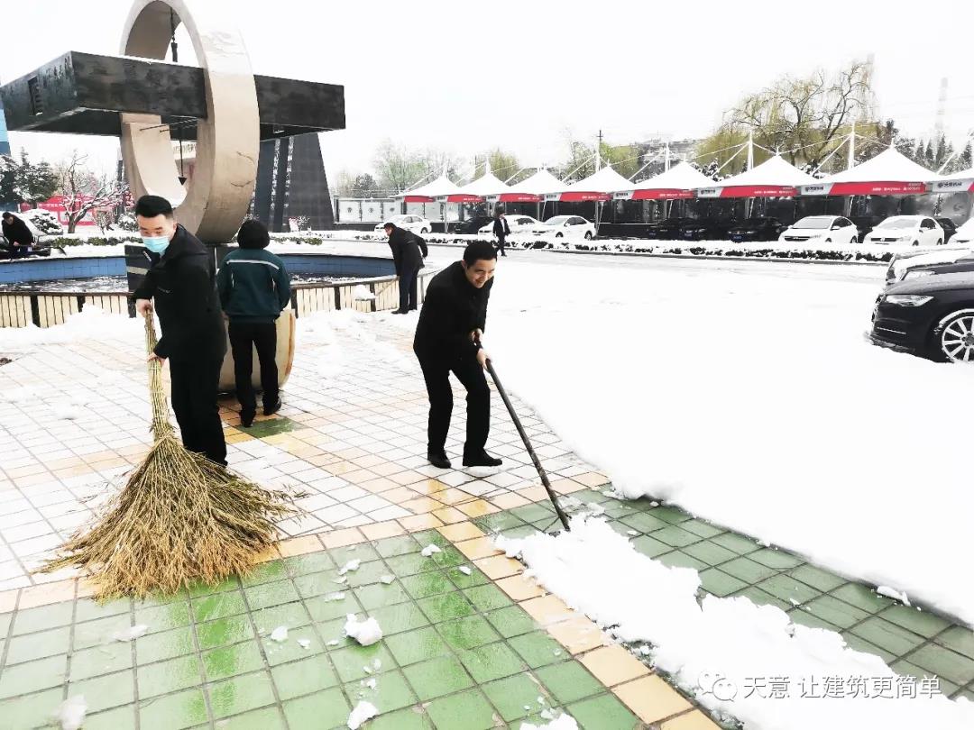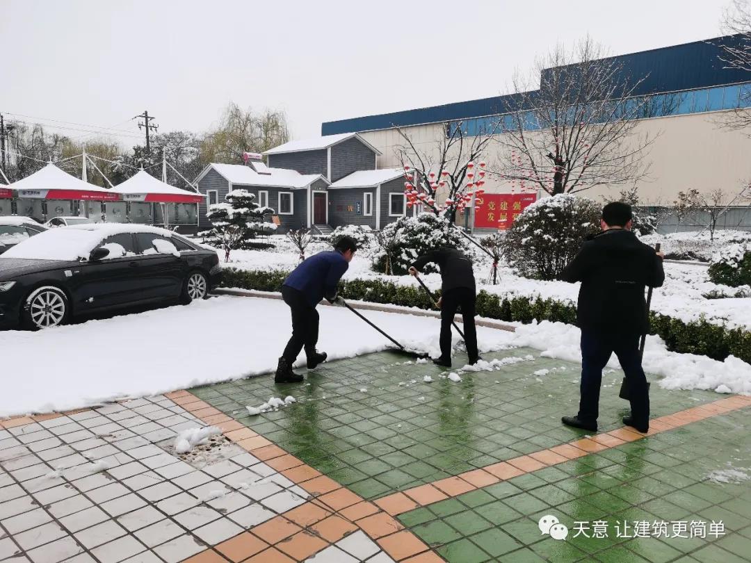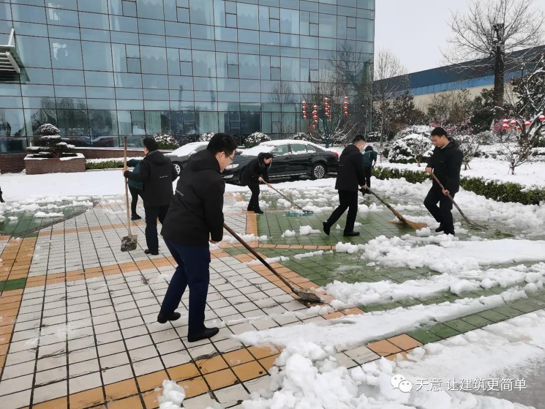 大雪悄然而至,一覺起來,窗外已是銀裝素裹。然而大雪的降臨也給大家的出行帶來諸多不便,公司大門口、辦公樓前的道路都被皚皚白雪覆蓋。早晨上班前,公司總經(jīng)理劉海龍、營(yíng)銷總監(jiān)郭川東帶領(lǐng)公司員工拿起掃帚鐵锨,滿懷激情,投入除雪當(dāng)中。整個(gè)除雪作業(yè)過程井然有序,熱火朝天,干勁十足,大家不懼寒冷,不怕手凍。鐵锨和地面的碰擊聲、掃帚清掃雪花的刷刷聲,不一會(huì)兒辦公樓前的積雪已蹤影全無,所到之處,雪沒了,路干凈了,掛滿枝頭的冰凌隨風(fēng)婆娑起舞,點(diǎn)頭稱贊,大家的心中更是無比的欣慰,雖然凍紅了臉、累出了汗,但累并快樂著。