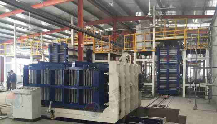 該復(fù)合墻板生產(chǎn)線立式旋轉(zhuǎn)臥式出板復(fù)合墻板成型機(jī),一次可生產(chǎn)四十塊墻板,該生產(chǎn)線主要分為:配料攪拌系統(tǒng)、墻板成型系統(tǒng)、液壓整體開(kāi)模系統(tǒng)、液壓翻轉(zhuǎn)系統(tǒng)、整體出板翻轉(zhuǎn)碼垛系統(tǒng)、成型機(jī)自動(dòng)循環(huán)系統(tǒng)、變頻擺渡系統(tǒng)、數(shù)控配電系統(tǒng)等部件 組成。該生產(chǎn)線自動(dòng)化程度高,液壓開(kāi)合模,解決了傳統(tǒng)立式復(fù)合墻板機(jī)人工開(kāi)合安全隱患,提高了工作效率。設(shè)備配有整體出板碼垛系統(tǒng),解決了傳統(tǒng)人工出板方式,減少產(chǎn)品的破損率,提高了產(chǎn)能。生產(chǎn)線使用密封式泵送系統(tǒng)配備雙工位注漿槍,注漿速度快密實(shí)度高,材料粘結(jié)更緊密。